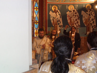 After the speech, Fr. Spyridon and Fr. Alexios took me to venerate the icons on the iconostasis (see above), before going into the altar. There I was led around the table three times, venerating each corner of the altar and the bishop's hand (see below).